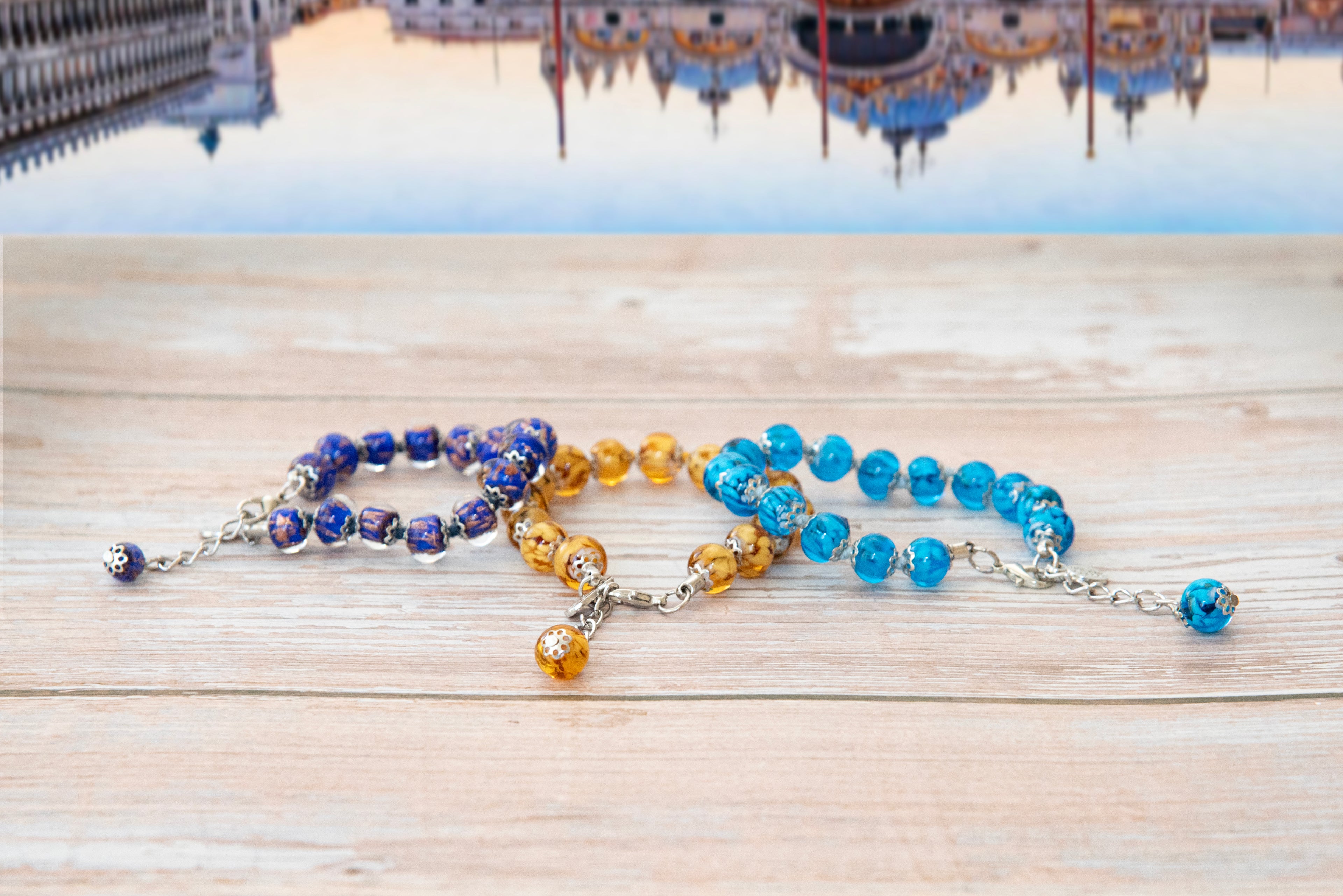 BDG2-Bracciale Decina in Vetro di Murano garantito, realizzato interamente a mano con 10 Perle da 8 mm lungo 19,5 cm - Gold (Nuvola 056 Azzurro)