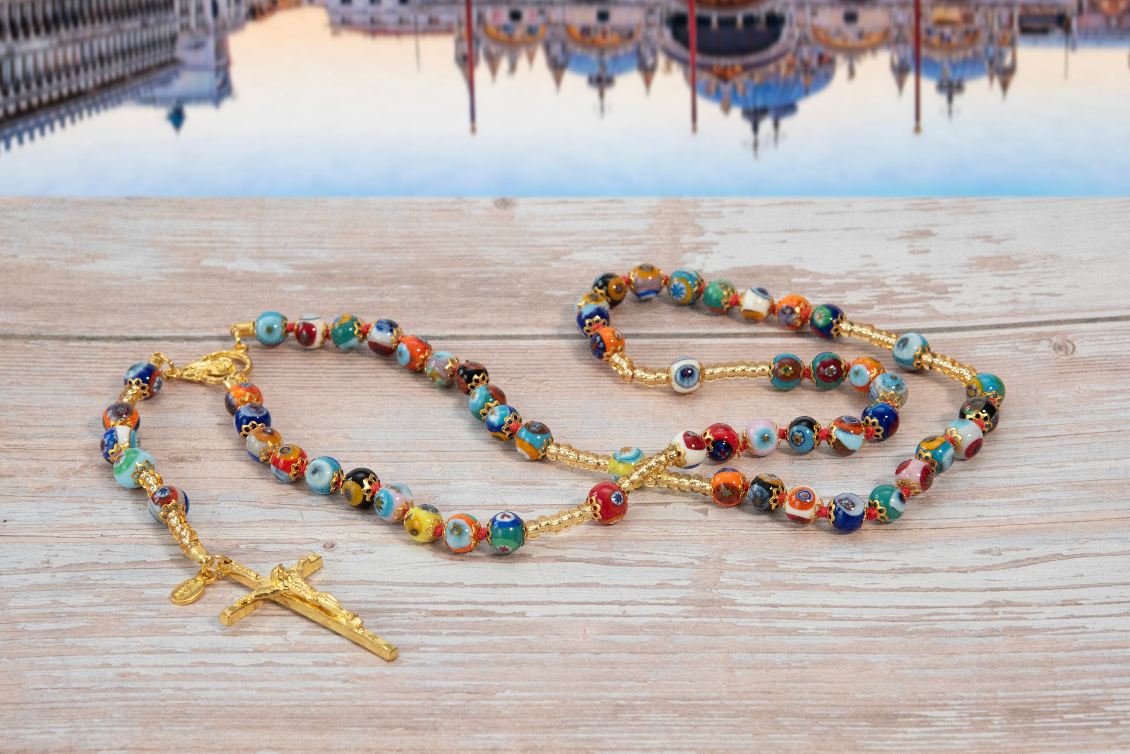 AG4-Rosario in Vetro di Murano garantito, realizzato interamente a mano con 59 Perle da 8 mm lungo 68 cm - Gold (Mosaico Multicolor)