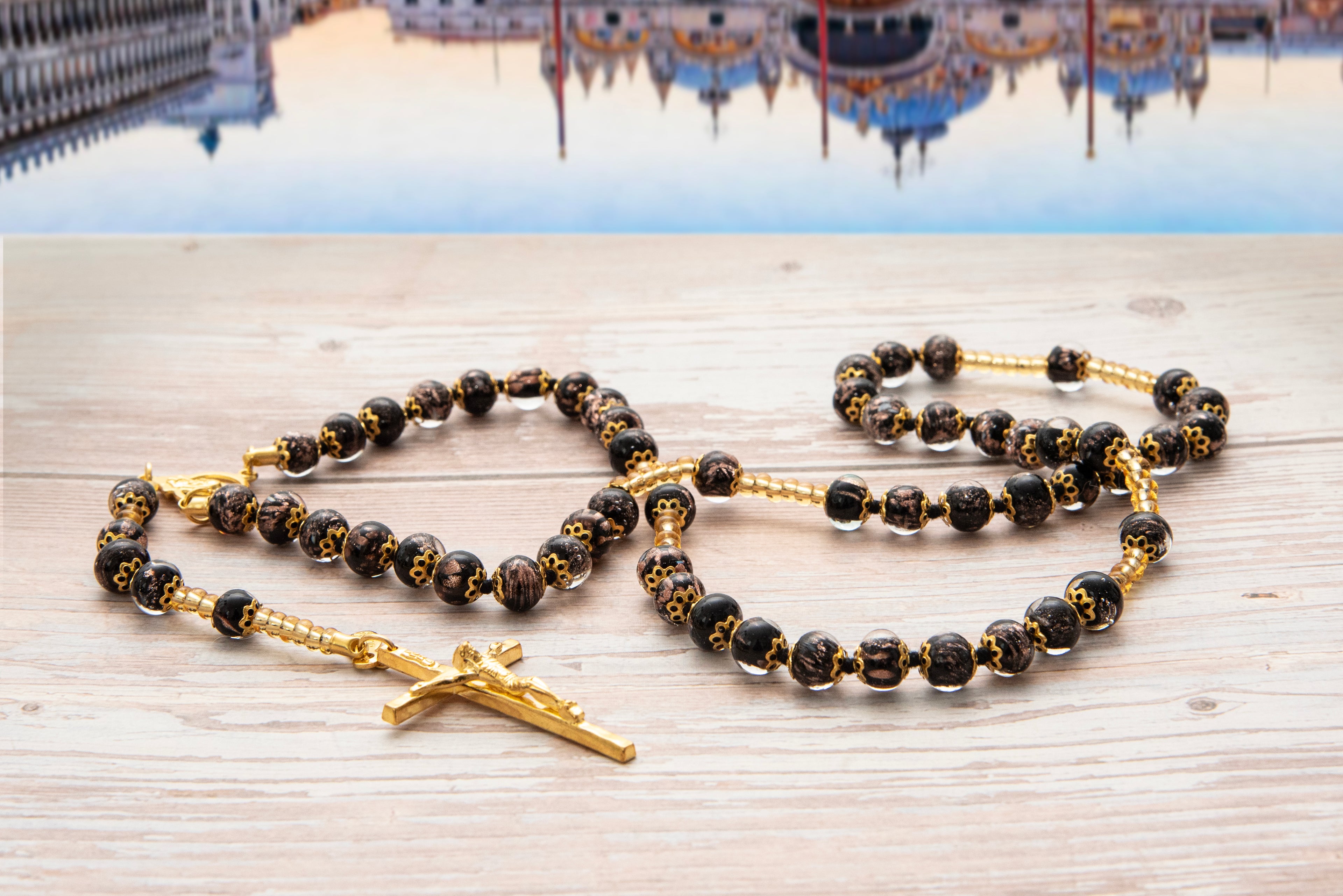 AG1-Rosario in Vetro di Murano garantito, realizzato interamente a mano con 59 Perle da 8 mm lungo 68 cm - Gold (Avventurina Pasta 064 Nero)