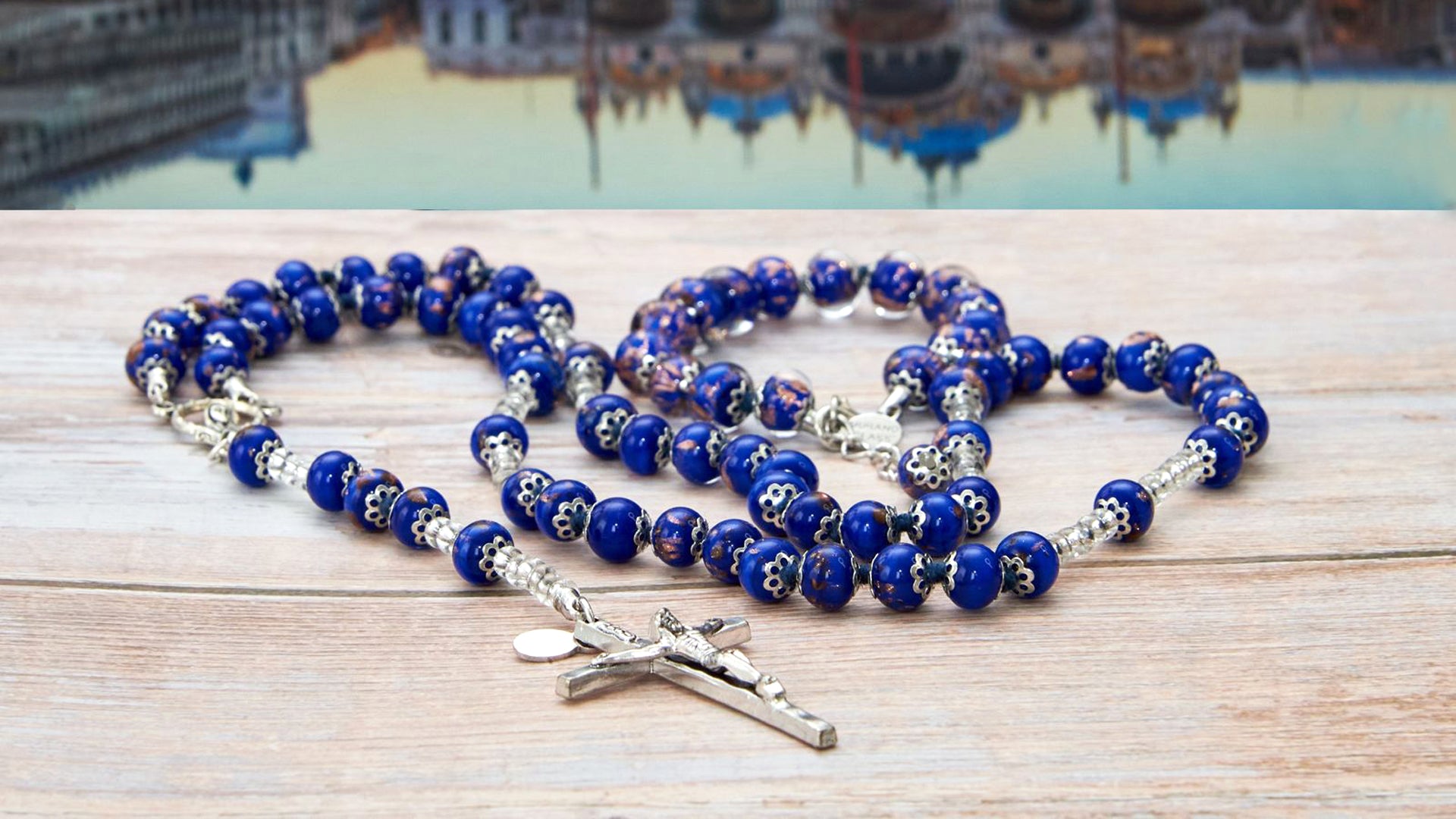 AS1-Rosario in Vetro di Murano garantito, realizzato interamente a mano con 59 Perle da 8 mm lungo 68 cm - Silver (Avventurina pasta 242 Blu Scuro)