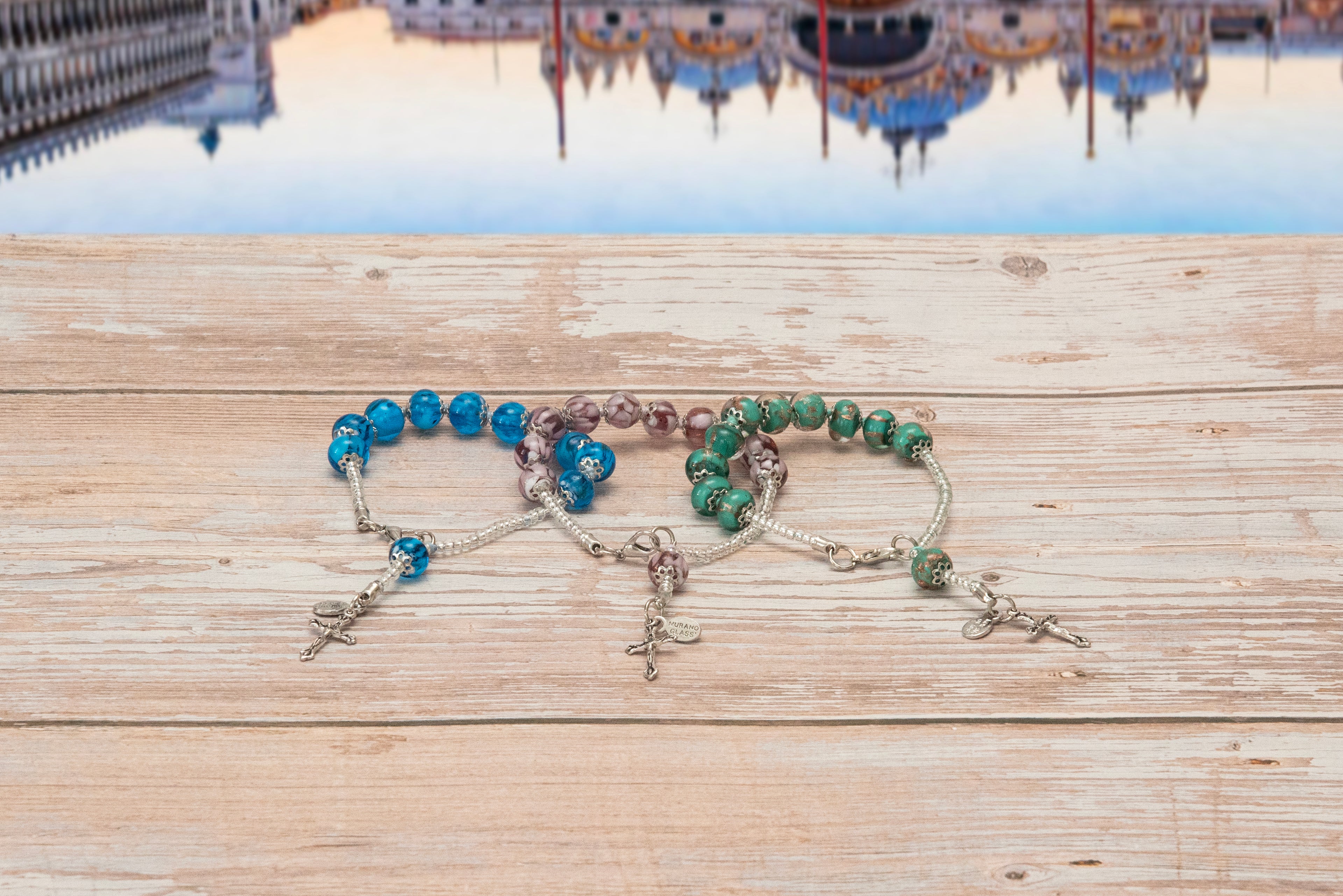 BDS6-Bracciale Decina in Vetro di Murano garantito, realizzato interamente a mano con 10 Perle da 8 mm lungo 19,5 cm - Silver (Nuvola 036 Azzurro)