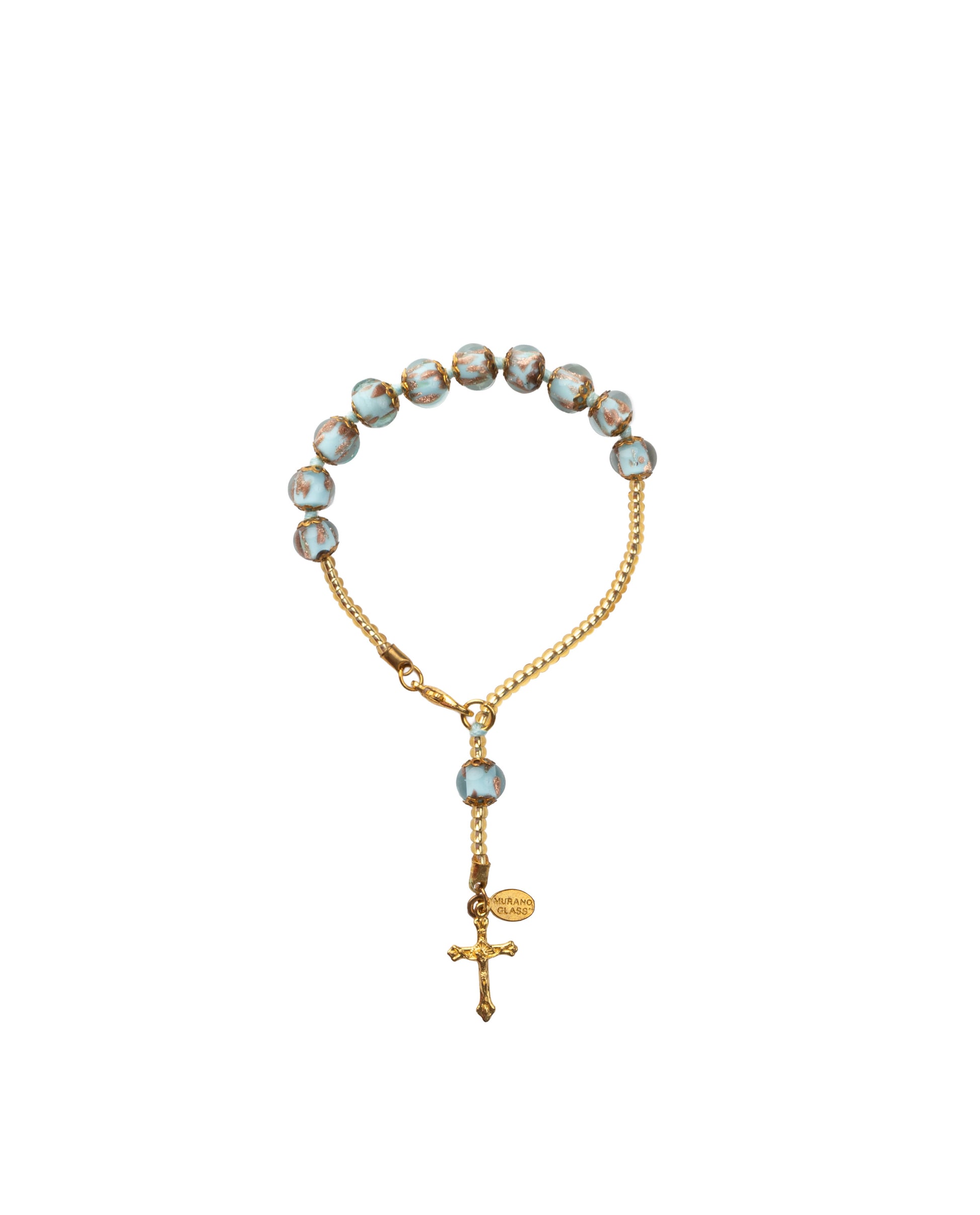 Bracciale Decina in pregiato vetro di Murano, realizzato interamente a mano secondo la tradizione veneziana con 10 Perle da 8 mm. Ogni perla è lavorata con cura artigianale, rendendo questo oggetto non solo un simbolo di fede ma anche una preziosa opera di artigianato veneziano. Lungo 19,5 cm, è impreziosito da un crocifisso finemente rifinito che completa l’insieme con sobria eleganza. Perfetto per la preghiera quotidiana o come dono speciale dal profondo significato simbolico - Gold (Avventurina pasta-224 azzurro chiaro)
