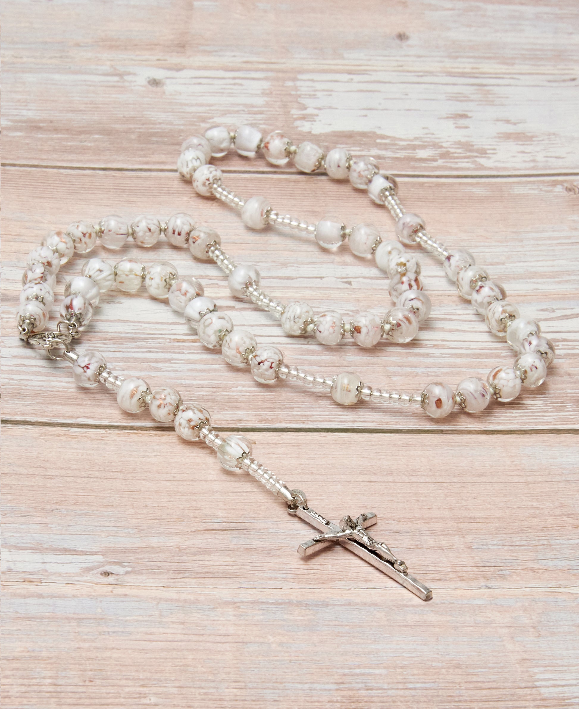 Rosario artigianale in pregiato vetro di Murano, realizzato interamente a mano secondo la tradizione veneziana con 59 Perle da 8 mm. Ogni perla è lavorata con cura artigianale, rendendo questo oggetto non solo un simbolo di fede ma anche una preziosa opera di artigianato veneziano. Lungo 68 cm, è impreziosito da un crocifisso finemente rifinito che completa l’insieme con sobria eleganza. Perfetto per la preghiera quotidiana o come dono speciale dal profondo significato simbolico - Silver (Nuvola 004 bianco) corredato da sacchetto regalo e garanzia
